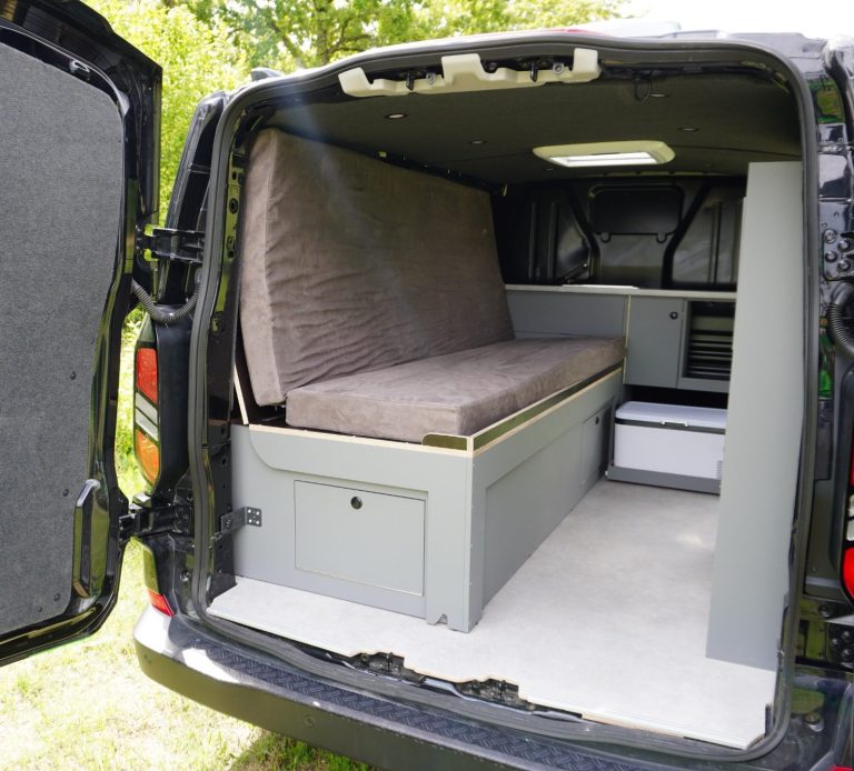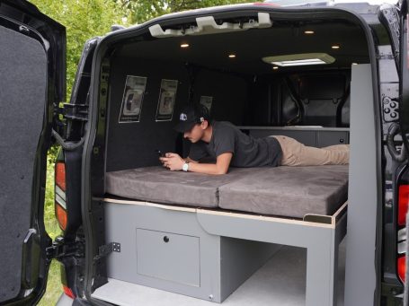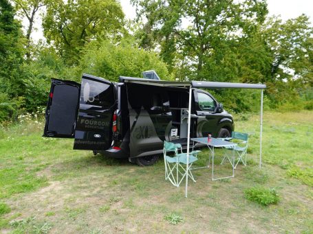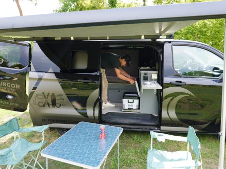 Un fourgon entièrement modulable, équipé de manière optimale, comprenant : une batterie de 2000 Wh, un panneau solaire, un réfrigérateur de 20 litres à compression, un lit de 130 x 190 cm, un évier, une douchette, un store, un bureau et des solutions de rangement diverses, le tout 100% amovible sans outils.